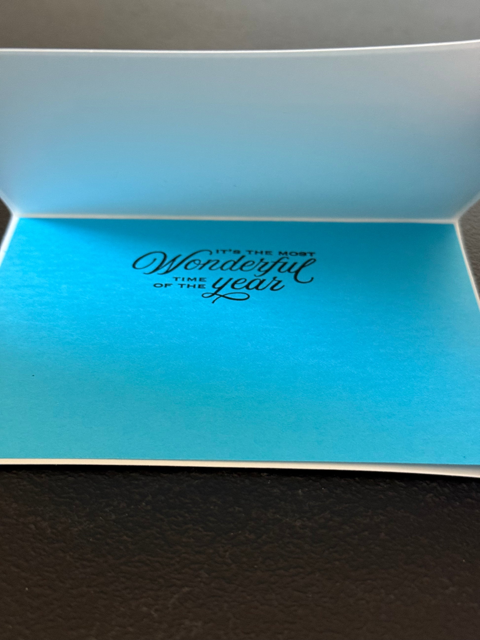 On this layered card this beautiful card has two Christmas Stockings hanging with just a bit of color brings Christmas greetings to your special person or family. This card comes in blue or red. Inside of the blue card reads "It's the Most Wonderful Time of the Year". Inside of the red card reads “May your days be merry and bright”. Cards made with ©Stampin' up! stamps, ©Stampin' up! embellishments, card stock, patterned paper and colored pens. Cards by Handmade Kards by Kim. Size 4.25" H x 5.5" W.