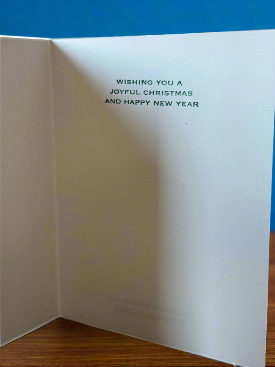 On this layered card this beautiful Star and leaf wreath brings Christmas greetings to your special person or family. Inside of the card reads "Wishing you a Joyful Christmas and a happy New Year". Made with ©Stampin' up! stamps, ©Stampin' up! embellishments, card stock and patterned paper. Cards by Handmade Kards by Kim. Size 5.5" H x 4.25" W.